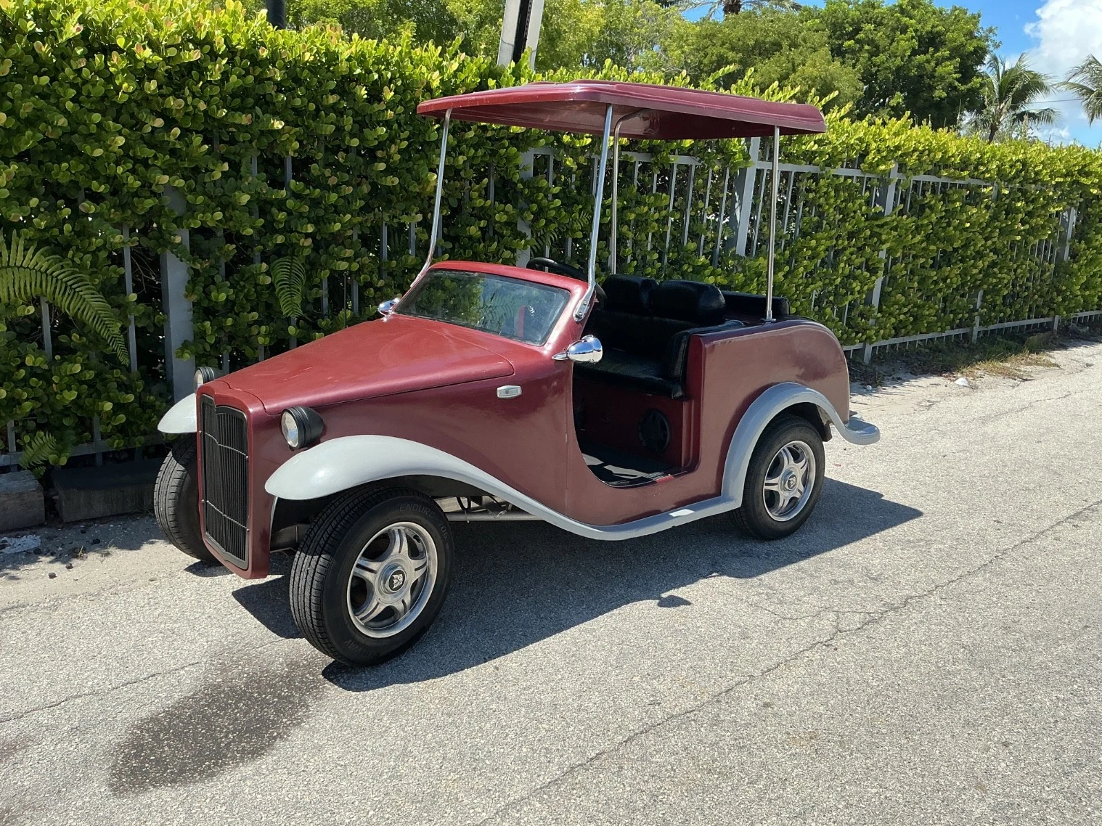 The front fascia is a work of art. A chrome-plated grille, often inspired by the classic “Veed” grille of a 1932 Ford or a Packard, dominates the front. Flanking the grille are large, round, chrome-bezeled headlights—fully functional and meeting NEV safety standards. A small, hood-mounted windshield—a “fly screen”—is sometimes present, adding another layer of period-correct detail. The front bumper is a simple, heavy-gauge chrome or stainless steel bar, curved to follow the shape of the body.