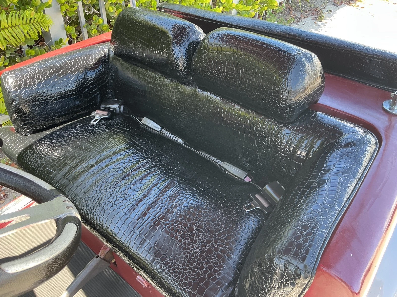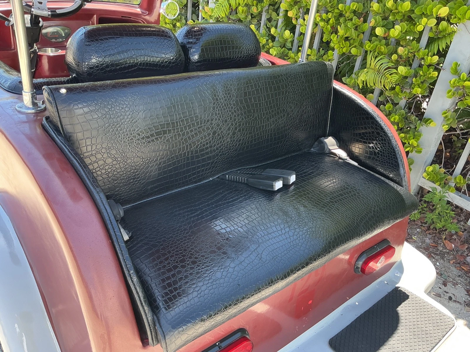 Stepping into the California Roadster is like stepping back in time. The interior is designed for two passengers (with a rear-facing “mother-in-law” seat or a full rear seat available on longer wheelbase models). The bench seat is upholstered in premium vinyl or marine-grade upholstery, often featuring diamond-tuck stitching or pleats, a hallmark of classic hot-rod interiors. The stitching is weather-resistant, allowing the cart to be parked outside or caught in a brief rain shower without damaging the interior.