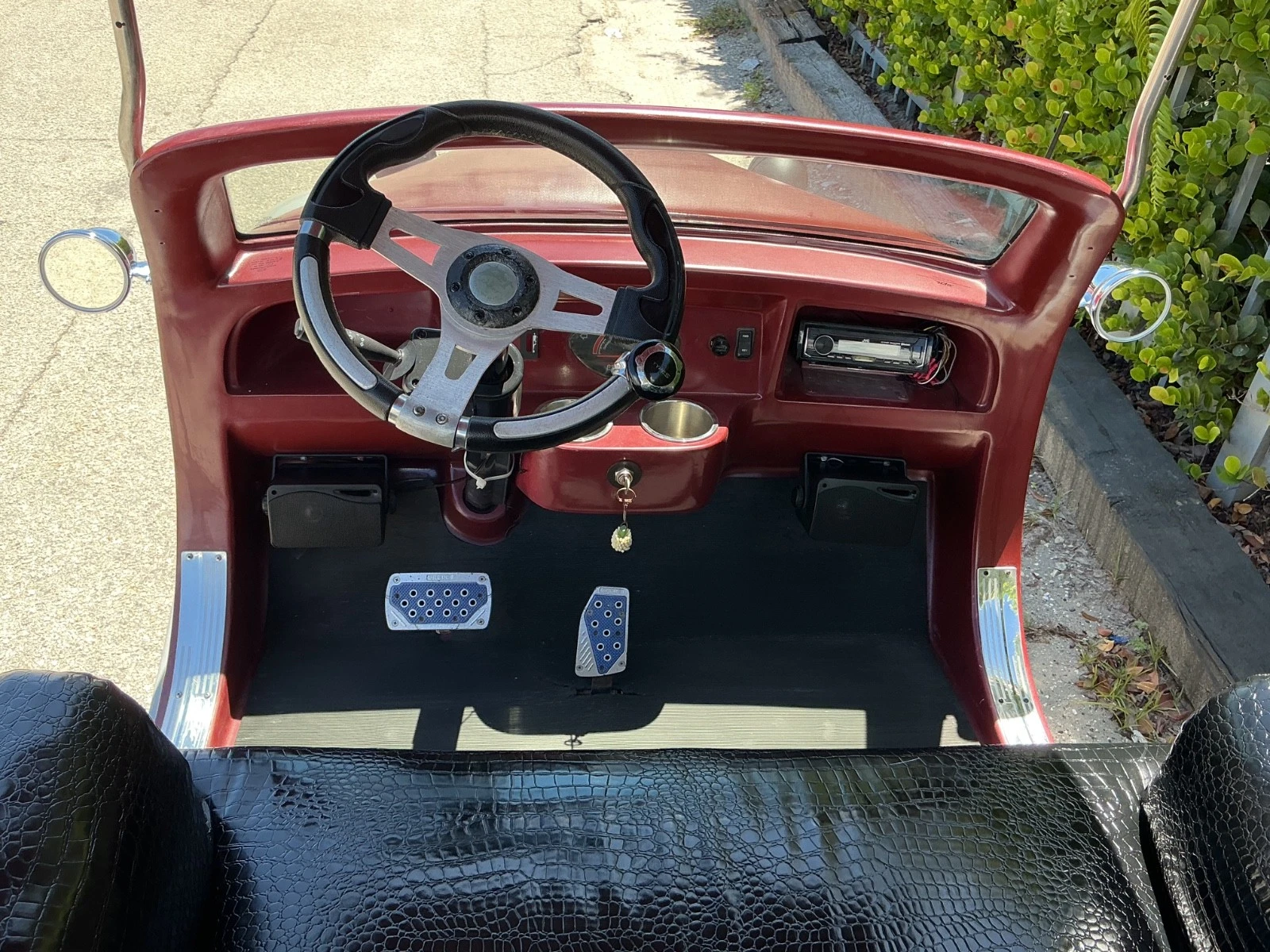The dashboard is a simple, elegant panel. A central instrument cluster houses a battery state-of-charge gauge, which is the primary information the driver needs. There may also be a voltmeter. Toggle switches, reminiscent of early aircraft, control the lights and accessories. There are no complex infotainment screens; the roadster experience is about the journey, not digital distractions. The floor is typically covered with a rubberized mat or indoor/outdoor carpeting, and the pedals—accelerator and brake—are simple, robust units.